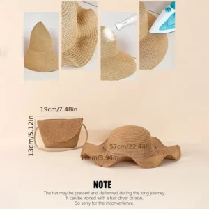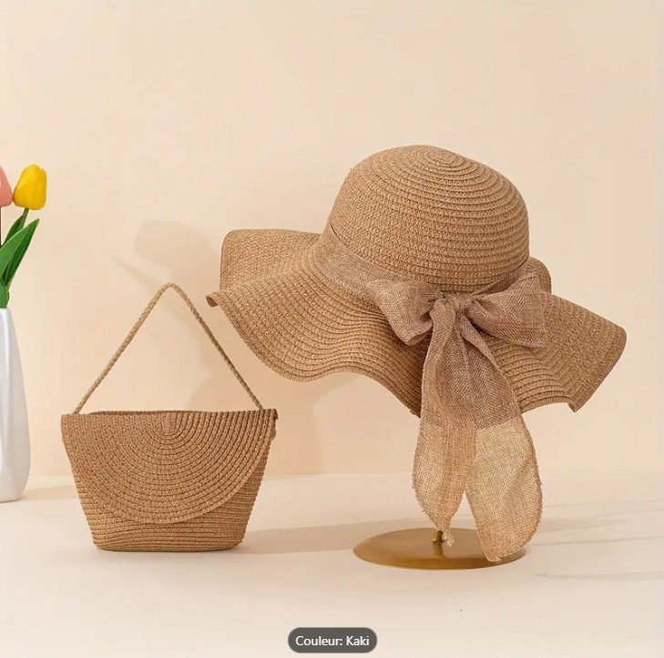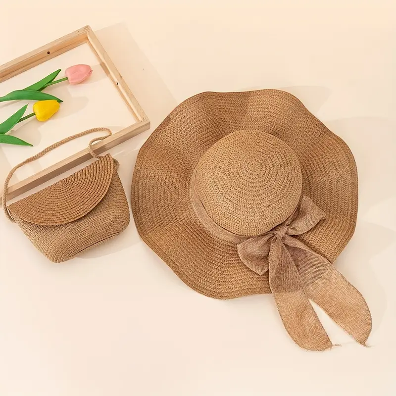 Chapeau de soleil à large bord pour femmes, 1 pièce, printemps/été, avec ruban à nœud et 1 combinaison de sac à main kaki, parfait pour la plage et les vacances