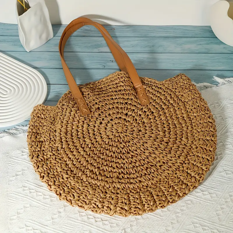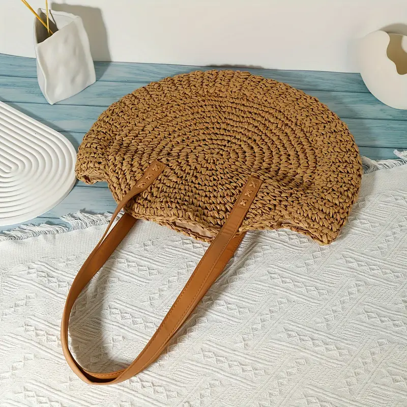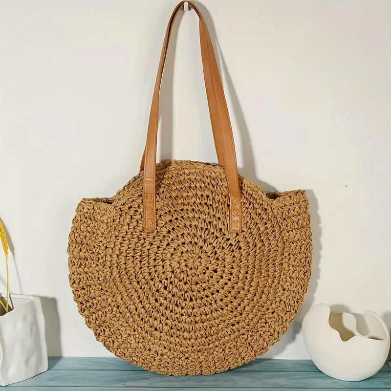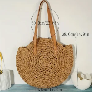 Sac à Épaule en Paille Fait Main Boho-Chic pour Femmes – Polyvalent & à la Mode, Parfait pour les Voyages Décontractés | Kaki